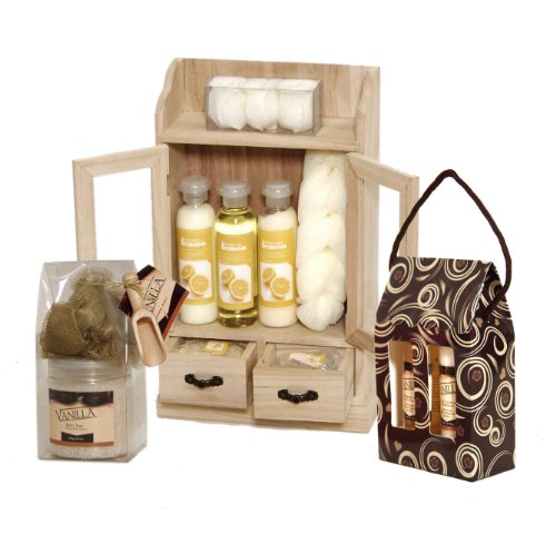 1x Sel de Bain au vanilla (270g), 1 eponge filet ou fleur de massage et 1 cuillère en bois.